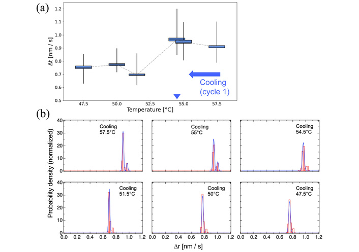 The PD histograms of nanoparticle displacements at Δt = 8 s were plotted and fitted with single or multiple Gaussian functions using IGOR Pro to describe the distribution of nanoparticle motion. When multiple Gaussian components were required, this was interpreted as the coexistence of distinct mobility populations near the phase transition. Box plots were generated directly from the pooled displacement data (Δr), where the box boundaries represent the 25th and 75th percentiles, the central line indicates the median, and the whiskers denote the minimum and maximum values.