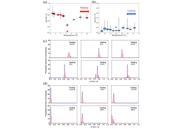 Temperature-dependent dynamics of DOPC membranes. Box plots of nanoparticle motion recorded between –25°C and 25°C during (a) heating and (b) cooling cycles. Red and blue arrowheads indicate the phase-transition temperatures manually identified from the EBMD data. The original box plots spanning the wide-range temperature are shown in Figure S3a and Figure S3b. Probability density histograms of particle displacements (c) near the main transition (3°C) and (d) crystallization (–20°C) temperatures, respectively. Histograms were fitted by Gaussian functions.