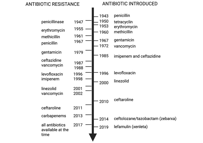 Figure 1 illustrates the parallel timeline of major antibiotic introductions and the subsequent emergence of resistant strains. The rapid appearance of resistance following clinical deployment underscores the persistent “arms race” between antimicrobial development and microbial adaptation. Currently, resistant infections are estimated to cause approximately 700,000 deaths annually worldwide, a figure projected to rise to 10 million deaths per year by 2050 in the absence of effective countermeasures [1, 3, 19].