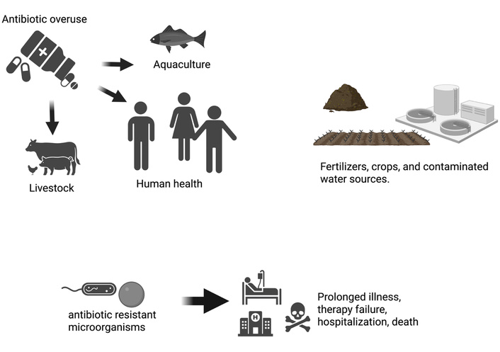 In addition to clinical misuse, subtherapeutic environmental antibiotic exposure is a major driver of AR. Widespread antibiotic application in medicine, veterinary practice, agriculture, and aquaculture, combined with insufficient wastewater treatment and pharmaceutical manufacturing effluents, has resulted in the continuous release of antimicrobial residues into soil and aquatic environments [6, 20, 21]. These conditions create persistent selective pressure that favors resistant microorganisms and facilitates the horizontal transfer of antibiotic resistance genes (ARGs).