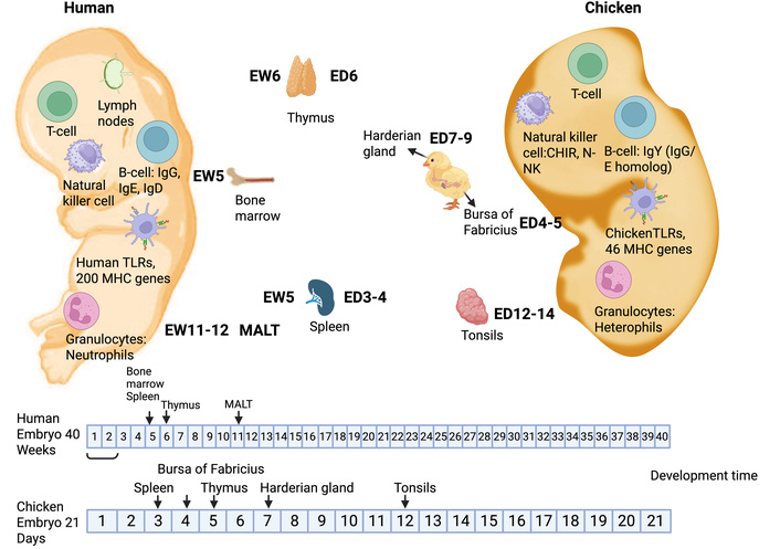 Comparative immune development in humans and chickens. Human immune maturation occurs over ~40 gestational weeks (embryonic weeks, EW), whereas chicken immune development is completed within 21 embryonic days (ED). Key primary and secondary lymphoid organs are shown, including the thymus, spleen, bone marrow (humans), and the bursa of Fabricius (chickens), as well as mucosa-associated lymphoid tissue (MALT) in humans and cecal tonsils in chickens, highlighting conserved functional immunity despite differences in developmental timing and MHC diversity. The figure was created in BioRender. Ruano, M. (https://BioRender.com/d52c6jx) is licensed under CC BY 4.0.