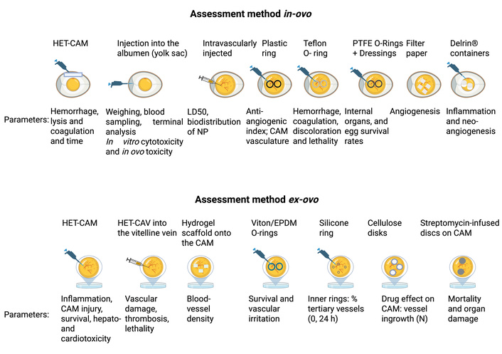 The CEM provides a vascularized and cost-effective system. It is ethically favorable for evaluating nanoparticle biodistribution, toxicity, and therapeutic efficacy. By enabling injection into the chorioallantoic membrane (CAM) or yolk sac, the CEM allows assessment of NP–host and NP–pathogen interactions, infection progression, and mid-throughput screening prior to mammalian studies [63, 64].