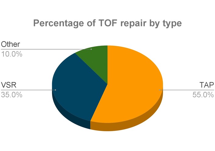 Percentage of TOF repair by type. 55.0% of TOF repairs were operated by TAP, 35.0% by VSR, and the other repair techniques utilized were 10.0% [35]. TOF: tetralogy of Fallot; TAP: transannular patch; VSR: valve-sparing repair.