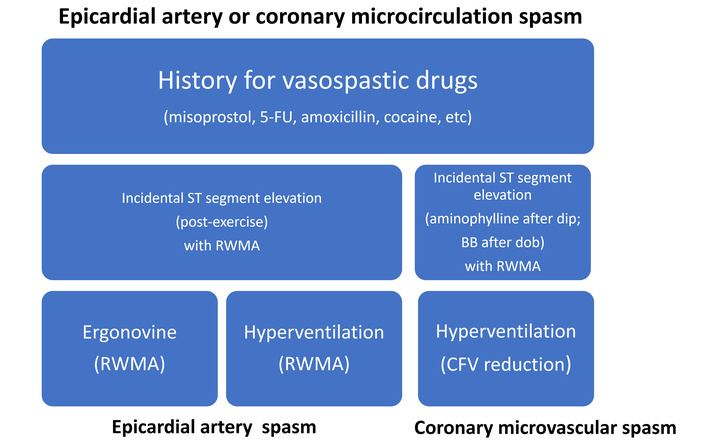 Three steps for CAS detection: clinical history, functional stress testing, and targeted testing. Epicardial CAS can be found incidentally during exercise or pharmacological testing for the diagnosis of chronic coronary syndromes with functional testing, and these findings are diagnostic of CAS and do not require further diagnostic testing: CAS has been proven. The progression to targeted noninvasive testing of coronary vasospasm with either ergonovine or hyperventilation is required only when there is a clinical suspicion, and the evidence of a CAS is still missing. BB: β-blocker; 5-FU: 5-fluorouracil; CAS: coronary artery spasm; CFV: coronary flow velocity; RWMA: regional wall motion abnormality.