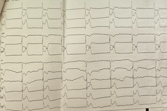 Approximately three hours after administration, the patient experienced acute, severe substernal chest pain. Electrocardiogram (ECG) revealed significant ST-segment elevation in inferolateral leads (Figure 1). Sublingual nitrates were promptly administered, resulting in the complete resolution of symptoms and ECG changes.