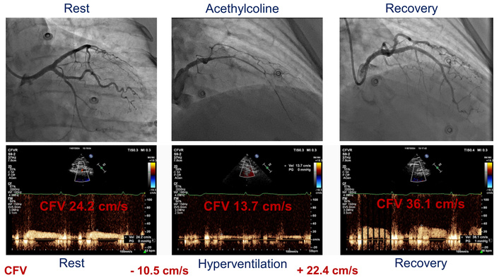 The paradoxical coronary flow pattern during the hyperventilation stress test and its angiographic correlate. lower panel: coronary flow velocity (CFV) in the left anterior descending (LAD) artery evaluated at rest, after hyperventilation, and in the recovery period; upper panel: coronary angiographic findings at rest, during intracoronary acetylcholine administration, and after intracoronary administration of nitrates.