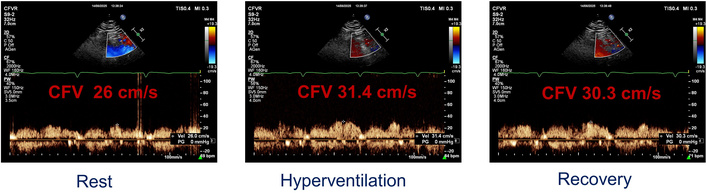 Coronary flow velocity (CFV) in the left anterior descending (LAD) artery evaluated at rest, after hyperventilation, and in the recovery period.