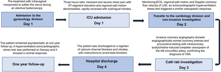 Timeline events and the treatment details in chronological order. ECG: electrocardiogram; LAD: left anterior descending; VSA: vasospastic angina.