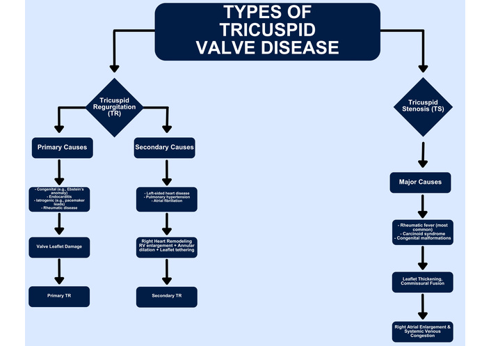 Tricuspid valve disorder (TVD), a critical aspect of valvular heart disease (VHD), significantly impacts cardiovascular health and is increasingly recognized as a significant cause of cardiovascular morbidity. TVD has contributed to a noticeable spike in mortality rate in the U.S. with evolving paradigms in classification. Current epidemiological estimates suggest that abnormalities of the tricuspid valve (TV) consist of various congenital and acquired lesions [1–3], but tricuspid regurgitation (TR) and tricuspid stenosis (TS) are the most prevalent. A schematic overview of the major types of TVD is shown in Figure 1. TR is diagnosed more frequently and impacts approximately 1.6 million Americans, with prevalence rising to 4% in individuals over 75 years of age due to aging and comorbidities. TS, although rare, is responsible for less than 1% of VHD in the U.S. [4, 5]. Once referred to as the “forgotten valve” due to relative disinterest compared to left-sided valves, it is now appreciated for its clinical importance, driven by technical advances in diagnosis and treatment modalities [6, 7], which have focused exclusively on inpatient diagnosis [8, 9]. Despite the poor prognosis for untreated TVD, surgical management is routinely considered only at the time of left-sided valve surgery (LSVS), and patients are typically addressed for isolated tricuspid valve surgery (ITVS) mainly in cases of advanced disease with significant right ventricular dysfunction [10, 11]. The treatment modalities for TVDs include both medical and surgical options. Medical therapy is the cornerstone of treatment and involves the use of diuretics to inhibit volume overload and slow the progression of right heart failure [2, 12]. According to the United States National Registry [13], 5,005 primary TV procedures were performed with an in-hospital mortality of 8.8% over 10 years. Surgical intervention consists of either TV repair or replacement. Valve repair is the most advantageous procedure, while valve replacement is preferred in refractory cases where the valve’s structure is severely compromised, as seen in endocarditis, carcinoid syndrome, and radiation injury [14, 15]. The American Heart Association and American College of Cardiology Guideline for the Management of Patients with Valvular Heart Disease recommends isolated TV repair or replacement as a class of recommendation IIa or IIb, both levels of evidence C [16].