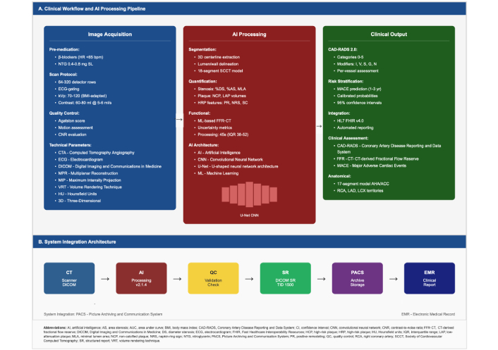 The clinical workflow and system architecture for AI-enabled CCTA analysis are summarized in Figure 2.