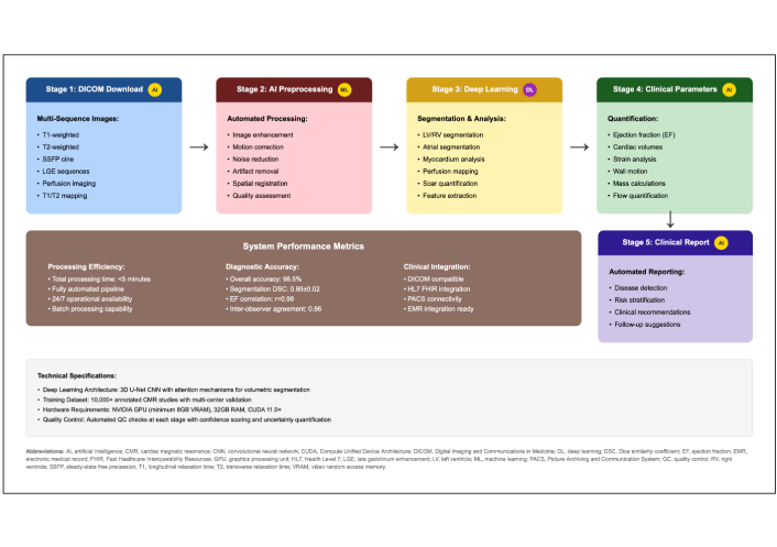Automated cardiovascular magnetic resonance (CMR) analysis workflow with AI integration. Stage 1—DICOM download of multi-sequence CMR (cine, LGE, T1/T2 mapping, perfusion, etc.). Stage 2—AI preprocessing (denoising, motion correction, intensity normalization, quality assurance). Stage 3—DL analysis for automated LV/RV chamber and myocardial segmentation, feature extraction, perfusion, and strain metrics. Stage 4—Clinical parameters: ejection fraction, ventricular volumes, mass, strain, and flow/valve quantification. Stage 5—Clinical report: automated, standardized, and structured. System performance/implementation notes: processing designed to complete within minutes per study, supports batch processing, exhibits high segmentation accuracy and reproducibility, is DICOM-compatible, and integrates with HL7/FHIR and electronic medical record (EMR) systems. DICOM: Digital Imaging and Communications in Medicine; DL: deep learning; LV/RV: left/right ventricle; LGE: late gadolinium enhancement; AI: artificial intelligence; HL7: Health Level Seven; FHIR: Fast Healthcare Interoperability Resources.