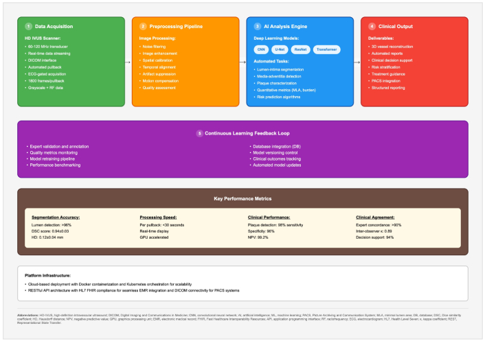 The end-to-end AI pipeline for HD-IVUS acquisition, analysis, and reporting is shown in Figure 4. Figure 4 illustrates automated lumen/media segmentation, plaque characterization, and decision-support outputs.