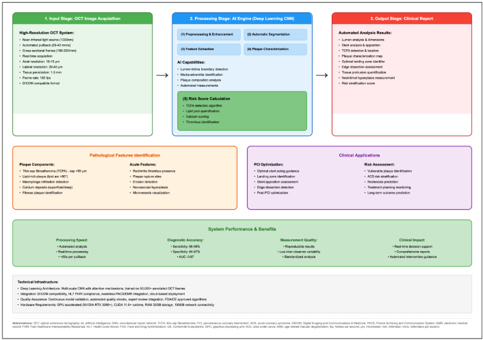 AI-enhanced optical coherence tomography (OCT) analysis platform: automated intracoronary image processing workflow. Input—OCT acquisition. High-resolution intracoronary pullbacks in a DICOM-compatible format. Processing—AI engine (deep learning CNN). (1) Preprocessing & enhancement; (2) automatic lumen/wall segmentation; (3) feature extraction; (4) plaque characterization; optional (5) risk-score calculators and automated measurements. Screenshot—user interface view showing automated lumen and wall segmentation overlays, plaque characterization outputs, and stent-planning suggestions (sizing and landing zones). Output—clinical report. Automated identification of lesions and high-risk features (e.g., TCFA, macrophage signal, calcium burden), quantification, stent-planning suggestions, and longitudinal follow-up visualization. Clinical applications. PCI optimization (device sizing, landing-zone selection, post-stent assessment) and risk assessment (event prediction, restenosis monitoring). System performance & benefits. Fast processing, high reproducibility/standardization, improved measurement quality, and comprehensive structured reports. CNN: convolutional neural network; DICOM: Digital Imaging and Communications in Medicine; PCI: percutaneous coronary intervention; TCFA: thin-cap fibroatheroma; AI: artificial intelligence.