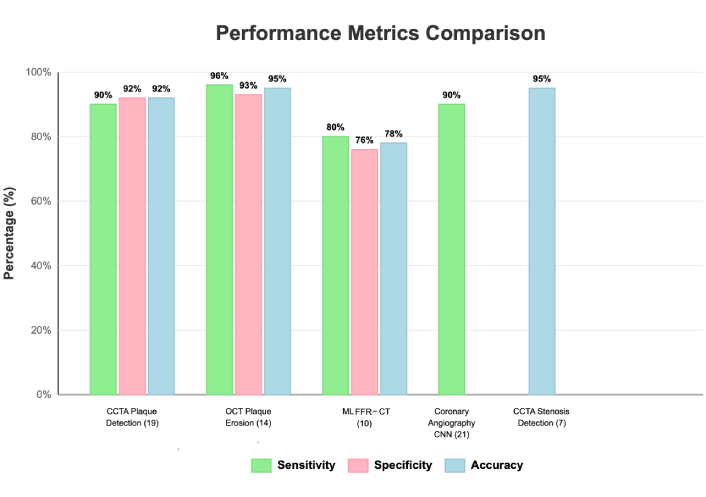Performance metrics and clinical validation of AI applications in cardiovascular diagnostics. Descriptive comparison of the study-reported diagnostic performance by modality and task. Bars display the median of study-level sensitivity, specificity, and—where available—accuracy within each category; parentheses indicate the number of contributing studies: CCTA plaque detection (N = 19), OCT plaque erosion (N = 14), ML FFR-CT (N = 10), coronary angiography CNN models (N = 21), and CCTA stenosis detection (N = 7). Due to heterogeneous thresholds and reference standards, no formal meta-analysis was performed; values are descriptive and not pooled estimates. Where only one bar appears for a method, the other metrics were not consistently reported in the source literature. Key findings. OCT-based plaque-erosion detection showed the highest sensitivity (~ 96%) with strong overall balance across metrics; CCTA plaque and stenosis detection demonstrated consistently high accuracy across studies; ML FFR-CT achieved moderate performance (~ 76–80%) with variability by lesion complexity and image quality; CNN-based analysis of coronary angiography yielded high sensitivity (~ 90%). Overall variability across tasks underscores the need for application-specific validation and ongoing algorithm refinement before broad clinical deployment. CCTA: coronary computed tomography angiography; CNN: convolutional neural network; FFR-CT: fractional flow reserve derived from CT; OCT: optical coherence tomography; AI: artificial intelligence; CT: computed tomography.