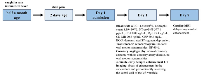 An 18-year-old man was hospitalized due to intermittent fever for half a month and chest pain for 2 days. The patient had a fever half a month ago after being caught in the rain, with a maximum temperature of 40°C. After taking antipyretics, the body temperature could return to normal. Five days ago, the patient suffered a fever again, with a maximum temperature of 40°C, accompanied by a sore throat, cough, and expectoration. Two days ago, the patient experienced chest pain (timeline in Figure 1).