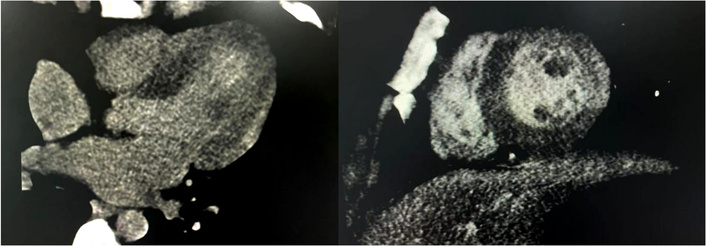 Full blood count: WBC 11.65 × 109/L, neutrophil count 8.19 × 109/L, NT-proBNP 397.1 pg/mL, cTnI 8.08 ng/mL, Myo 25.4 ng/mL, CK-MB 90.6 ng/mL, CRP 60.3 mg/L. ECG demonstrated ST-segment depression. A transthoracic echocardiogram performed 1 day after admission showed no focal wall motion abnormalities and a normal ejection fraction of 60%. CT coronary angiography performed on the same day showed normal coronary anatomy with no CAD, no wall motion abnormalities. Three-minute early delayed enhancement CT imaging demonstrated a focus of enhancement in the subcardia and predominantly involving the lateral wall of the left ventricle (Figure 2). A subsequent cardiac MRI performed 7 days later showed delayed myocardial enhancement seen on the CTA. After resolution of his symptoms and normalization of his cardiac enzymes and function, the patient was discharged home on day 7 with the presumptive diagnosis of viral myopericarditis.