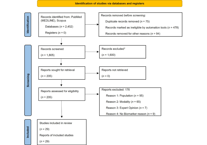 The remaining 205 full-text articles were reviewed for eligibility. Of these, 176 articles were excluded due to ineligible population (n = 95), inappropriate imaging modality (n = 65), expert opinions or narrative reviews (n = 7), and absence of cardiac CT biomarker focus (n = 9). Ultimately, 29 studies were included in the final systematic review. The study selection process is illustrated in the PRISMA flow diagram (Figure 1).