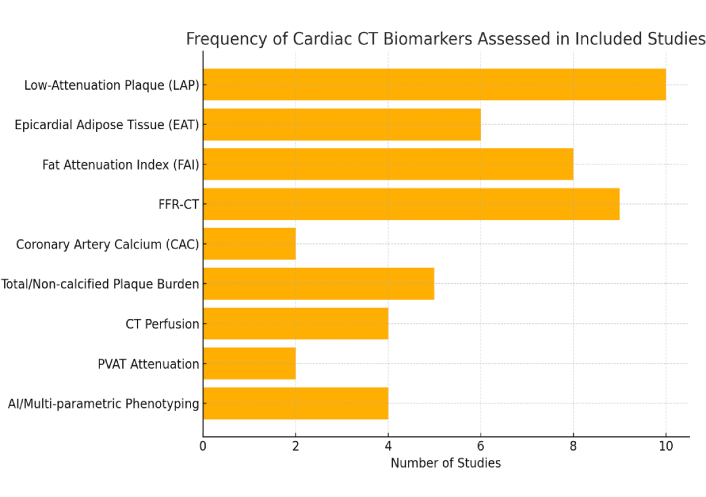 The most frequently evaluated cardiac CT biomarkers were LAP, perivascular FAI, FFR-CT, total plaque burden (TPB), NCPB, and EAT volume. Several studies have also examined CTP imaging, including both static and dynamic perfusion protocols, particularly in the assessment of microvascular dysfunction. Emerging applications such as delayed enhancement and tissue characterization by CT were also represented in select studies (Figure 2).