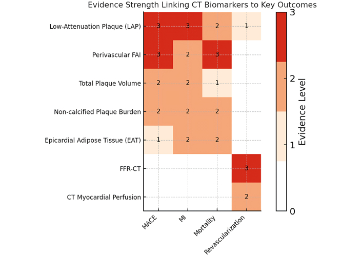 Figure 3 summarizes the strength of evidence linking each CT biomarker to clinical outcomes. LAP and FAI demonstrate the most consistent prognostic associations, while functional markers such as FFR-CT primarily guide downstream management decisions.