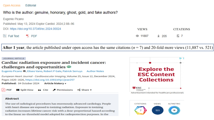For example, in 2024, I published two papers almost simultaneously: one in a high-impact journal, after a long and grueling peer-review process with prominent co-authors, and the other in Exploration of Cardiology, a journal that, at the time, had no impact factor and was not yet indexed in PubMed but offered open-access publication. One year later, the high-impact journal article with pay-per-view access had been viewed 521 times, with 7 citations, while the open-access article had the same 7 citations and was viewed 20 times more, with close to 12,000 views (Figure 1).