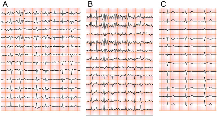 Electrocardiographic (ECG) monitoring during an ergometric stress test (EST) in an 80-year-old woman (Case 1). Supraventricular premature contractions (SVPCs) before starting EST (A) increased with EST. Atrial fibrillation (AF) in EST (B) disappeared several minutes after the EST (C).