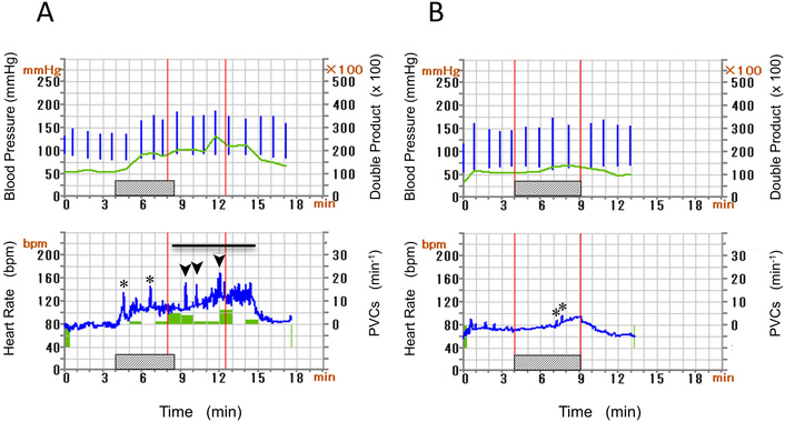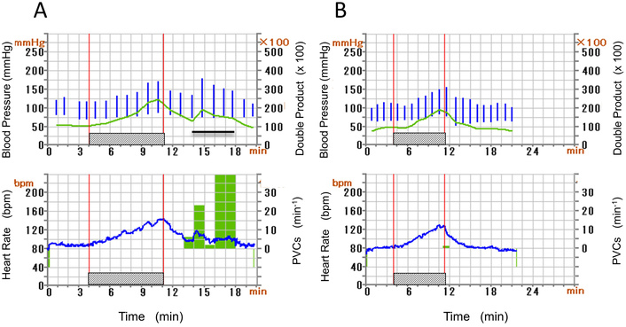 Hemodynamic parameters and arrhythmia count were the same as in Figures 2A–B indicated before and after starting bisoprolol (Case 2). Hatched bars indicate EST. PVCs after the exercise (A) are not observed in (B). Post-exercise increase in double product (A) corresponds to the repetitive PVCs (horizontal bar). The time scale in (B) differs from that in (A). EST: ergometric stress test; PVCs: premature ventricular contractions.