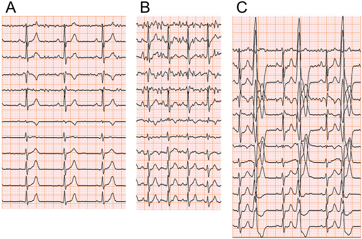 ECG monitoring in a 39-year-old woman (Case 2). (A, B) No arrhythmia was recorded before and during EST. (C) PVCs appeared 2 minutes after terminating EST. Ventricular bigeminy lasted for 3 minutes during recovery time. ECG: electrocardiogram; EST: ergometric stress test; PVCs: premature ventricular contractions.