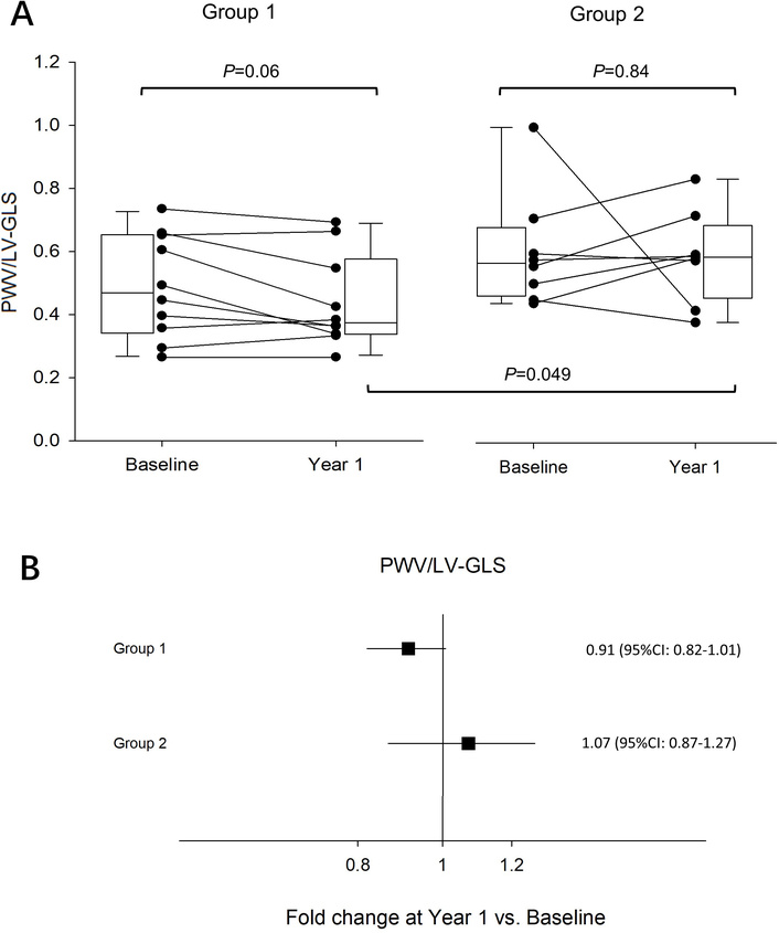 Pulse wave velocity (PWV) to left ventricular global longitudinal strain (LV-GLS) before (Baseline) and after (Year 1) physical activity. (A) Differences in PWV/LV-GLS ratio at baseline and year 1 in group 1 performing moderate-to-vigorous physical activity (MVPA) at ≥ 1,000 metabolic equivalent of task (MET) minutes per week, and in group 2 with MVPA at < 1,000 MET minutes per week. The bottom of each box represents the 25th percentile, the top the 75th percentile, and the line in the middle the median, with the corresponding value; whiskers are the minimum and maximum values. P values are displayed for paired comparisons between baseline and year 1 within the groups and differences between groups at year 1. (B) Fold change in PVW/LV-GLS ratio at year 1 compared with baseline in Group 1 (n = 10) and 2 (n = 8). Results are displayed as mean fold change ± 95% confidence intervals (CI).