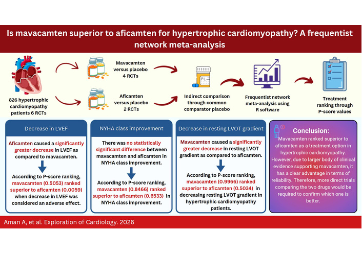 This network meta-analysis showed that mavacamten demonstrated greater efficacy than aficamten in indirect comparison, thus it ranked superior between the two myosin inhibitors to be used. However, this ranking is based not on the absolute clinical benefit but on the point estimates. Therefore, additional head-to-head trials comparing the two medications directly would be necessary to provide conclusive evidence that one is superior to the other. The final choice will probably rely on the patient, the severity of HCM, and the response to treatment, as both of these medications are valuable additions to the cardiology toolbox.