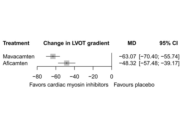 | Change in resting LVOT gradient | Aficamten | Mavacamten | 14.74 [3.02; 26.47] | 0.00 |