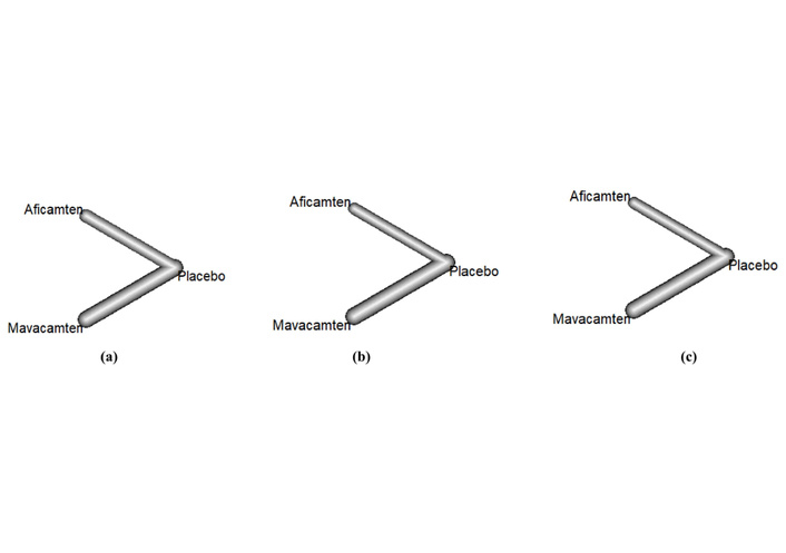 Direct comparison of mavacamten versus placebo and aficamten versus placebo; and indirect comparison of aficamten versus mavacamten through a common comparator placebo.