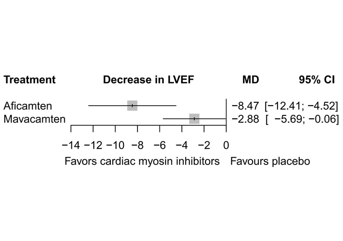| Decrease in LVEF | Aficamten | Mavacamten | –5.59 [–10.43; –0.75] | 0.00 |