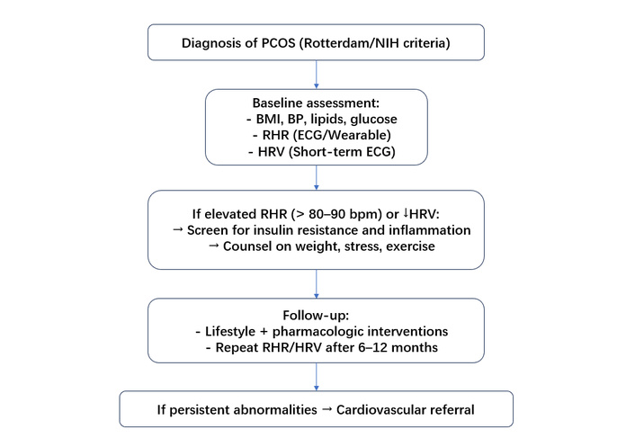 Suggested clinical framework for incorporating resting heart rate and heart rate variability into early cardiovascular risk assessment in women with PCOS. BMI: body mass index; BP: blood pressure; ECG: electrocardiogram; HRV: heart rate variability; NIH: National Institutes of Health; PCOS: polycystic ovary syndrome; RHR: resting heart rate.