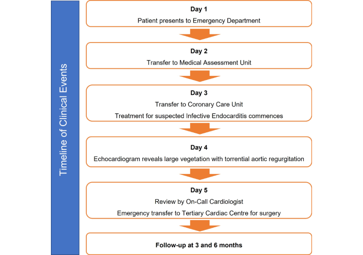 A 48-year-old Caucasian man with no known structural heart disease and no significant past medical history presented to the emergency department on multiple occasions over several weeks with non-specific systemic symptoms, including intermittent fever, malaise, and exertional breathlessness. He was previously fit and well, with no history of cardiac disease, intravenous drug use, or recent dental procedures. Notably, the onset of symptoms followed a recent recovery from a confirmed COVID-19 infection.