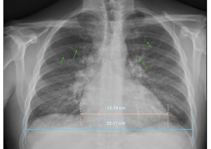 Chest X-ray demonstrating cardiomegaly with upper lobe diversion (thin green arrows).