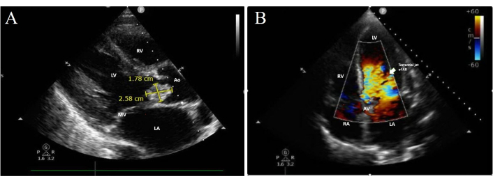 Transthoracic echocardiography (TTE) revealed a severely dilated left ventricle (LV) with mildly reduced systolic function, alongside a normal right ventricle (RV). A large vegetation measuring 2.58 cm × 1.78 cm was visualised on the flail left coronary cusp of the aortic valve (AV) (Figure 3A), resulting in torrential aortic regurgitation (AR) (Figure 3B).