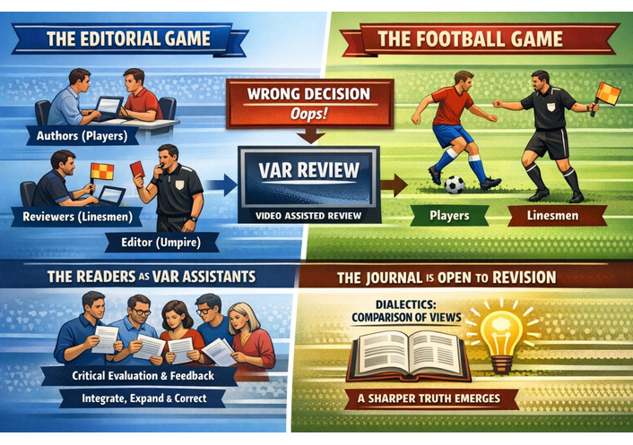 I thank Dr. Daly and Dr. Teixeira da Silva for their interest in my article and for their thoughtful, important, and original contribution [1]. This is precisely the purpose of my article [2]—and the previous ones on the role of authors and reviewers in the Journal—to spark a debate on the strengths and weaknesses of the contemporary editorial game. In this game, authors are the players, reviewers are the linesmen on the sidelines, and the editor is the umpire. However, it is not uncommon for the umpire, in good faith, to make a wrong decision, only to be called back for revision through the video-assisted review. In the editorial context, the video-assisted review assistants are the readers, who critically evaluate the journal’s content and integrate, expand, and correct it when necessary (Figure 1).