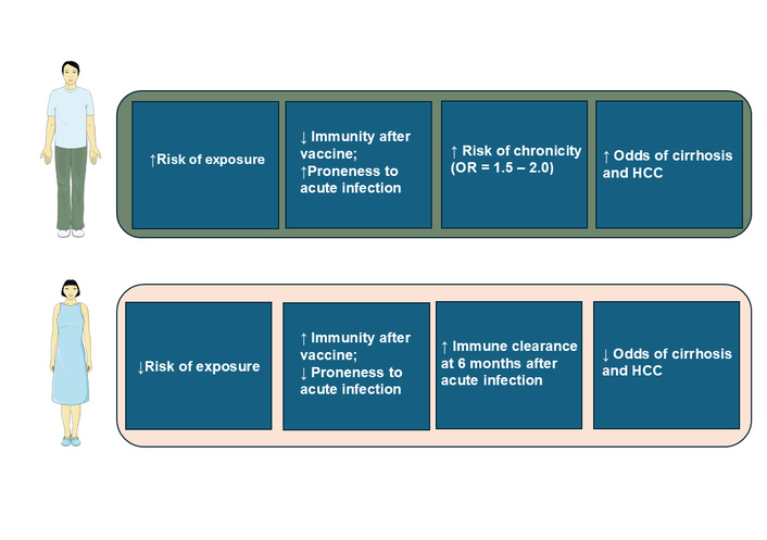 Schematic overview of sex disparities in hepatitis B virus (HBV) infection. This cartoon summarizes sex differences as a function of risk of exposure, immunity after vaccination, risk of chronicity, cirrhosis, and hepatocellular carcinoma (HCC). The figure was created with SMART - Sevier Medical Art (https://smart.servier.com/) under the CC BY 4.0 license, and was adapted from [47]. © 2022 Brown R et al. Licensed under a Creative Commons Attribution License.