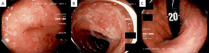 Ileocolonoscopy findings: (A) severe inflammation at the appendiceal orifice, and (B) hepatic flexure with (C) normal-appearing rectum visualized in retroflexion.
