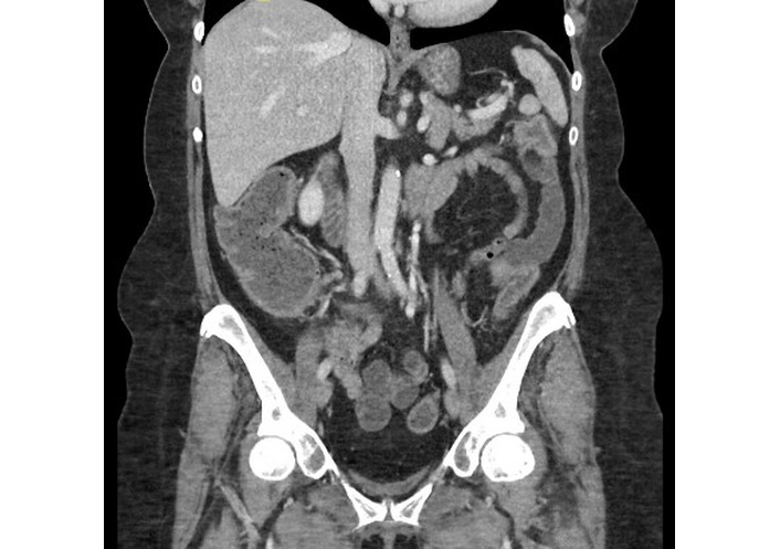 Five days post-discharge, the patient returned to the general surgery clinic with purulent drainage from a right pelvic Jackson-Pratt drain and right flank pain and was sent directly to her local emergency department for further evaluation. Vitals revealed (temperature 37.3°C, heart rate 115 bpm, respiratory rate 18 breaths per minute, blood pressure 126/76 mmHg, oxygen saturation 98% on room air). Laboratory results included WBC 18.9 × 103/µL, HGB 9.4 g/dL, PLT 490 × 103/µL, ALB 3.0 g/dL, and CRP 13.98 mg/dL. A contrast-enhanced (IV, PO, and rectal) abdominal CT showed post-surgical changes but no small bowel obstruction or contrast extravasation. A 4.0 cm × 7.4 cm × 7.2 cm rim-enhancing fluid collection with multiple air foci was identified in the right hemiabdomen (Figure 5). Physical examination, once admitted to the general surgery service, revealed greenish discoloration on the surgical dressing. Upon removal, a wound gap with fascial separation was identified, along with fecal leakage into the wound from a separated stoma appliance. Exploratory laparotomy confirmed mid-abdominal fascial dehiscence and a peri-hepatic abscess. The abscess was evacuated, the right Jackson-Pratt drain was repositioned, and a new left upper quadrant drain was placed. Wound cultures were polymicrobial, including 1+ Candida albicans. The treating teams initiated IV ciprofloxacin, IV metronidazole, and IV fluconazole, while low-dose PO prednisone 20 mg was continued due to concerns for secondary adrenal insufficiency from the prior hospitalization. By hospital day 3 of readmission, she had remained afebrile and without leukocytosis for 24 hours. She was discharged on PO ciprofloxacin, PO metronidazole, and PO fluconazole to complete a 3-week course.