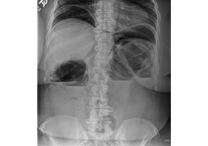 Upright abdominal radiograph demonstrating significant intraperitoneal free air, marked colonic dilation, and large air-fluid levels, consistent with bowel perforation.