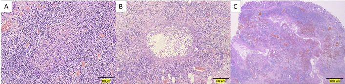 Hematoxylin and eosin-stained sections of the resected colectomy specimen. (A) High-power view showing a non-caseating granuloma. (B) High-power view showing a submucosal abscess. (C) Low-power view demonstrating acute, severe transmural inflammation.