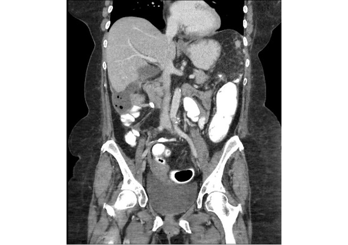 Coronal contrast-enhanced CT of the abdomen demonstrating a 4.0 cm × 7.4 cm × 7.2 cm rim-enhancing fluid collection with multiple air foci located in the right hemiabdomen, consistent with an intra-abdominal abscess.