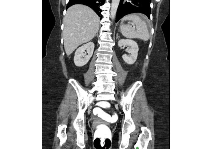 Coronal contrast-enhanced CT of the abdomen demonstrating a 9.0 cm × 1.2 cm left subdiaphragmatic fluid collection with peripheral enhancement. CT: computed tomography.