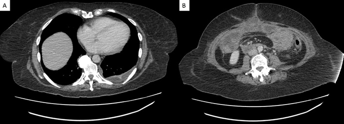 Follow-up transverse CT imaging findings. (A) Left pleural effusion with a split pleura sign, indicative of empyema. (B) Midline rim-enhancing fluid collections within the postsurgical midline incision. CT: computed tomography.