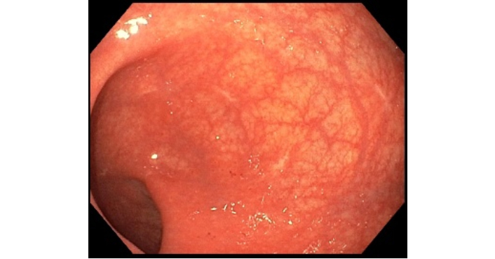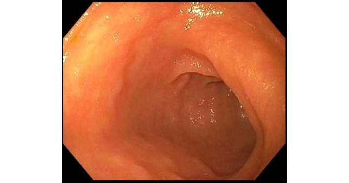 Approximately 4 months after discontinuing IXE and 3 months post-extended right hemicolectomy with end ileostomy, the patient underwent ileoscopy and flexible sigmoidoscopy with our team for disease surveillance. Ileoscopy revealed a normal-appearing ileum, with findings confirmed on histology (Figure 8). Flexible sigmoidoscopy showed normal descending and sigmoid colon and mild rectal changes, including faint erythema and punctate hemorrhages with air insufflation, endoscopically suggestive of mild diversion colitis (Figure 9). Sigmoid biopsies revealed focal active colitis without evidence of chronic changes, whereas rectal biopsies demonstrated mild chronic active colitis with non-necrotizing granulomata. Our team recommended a 3-month course of short-chain fatty acid enemas, followed by repeat flexible sigmoidoscopy and routine IBD surveillance labs to evaluate for resolution of mild colitis.