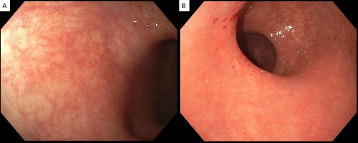 Flexible sigmoidoscopy findings. (A) Normal-appearing sigmoid colon. (B) Rectal changes are characterized by faint erythema and punctate hemorrhages caused by air insufflation.