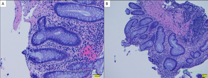 Hematoxylin and eosin-stained sections of the left colon and rectum showing mild crypt architectural distortion without evidence of acute or chronic inflammation at both high-power (A) and low-power (B) views.