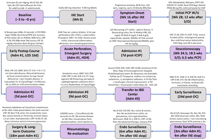 Timeline of presentation, treatment, complications, and recovery in a 54-year-old woman with severe IL-17 inhibitor-associated Crohn’s disease. 2/2: secondary to; 5-ASA: 5-aminosalicylic acid; ABD: abdominal; AC: ascending colon; ADM: admission; AFEB: afebrile; ALB: albumin; AMOX/CLAV: amoxicillin–clavulanate; AXBS: antibiotics; BCXS: blood cultures; BMS: bowel movements; BROAD-SPEC: broad-spectrum; BUD: budesonide; BXS: biopsies; CASPAR: Classification Criteria for Psoriatic Arthritis; CIPRO: ciprofloxacin; CMV: cytomegalovirus; CRP: C-reactive protein; CSP: colonoscopy; CT: computed tomography; CTE: computed tomography enterography; DC: discharge; DX: diagnosis; EI: end ileostomy; ENDO: endoscopic; ERH: extended right hemicolectomy; ESR: erythrocyte sedimentation rate; EX-LAP: exploratory laparotomy; FC: fecal calprotectin; FLX SIG: flexible sigmoidoscopy; GI: gastrointestinal; HD: hospital day; HGB: hemoglobin; HR: heart rate; IBD: inflammatory bowel disease; ICSP: ileocolonoscopy; IFX: infliximab; IR: interventional radiology; IV: intravenous; IXE: ixekizumab; KUB: kidneys-ureters-bladder radiograph; LLQ: left lower quadrant; LOS: length of stay; LUQ: left upper quadrant; METHYL-PNL: methylprednisolone; NEG: negative; NL: normal; NSAIDs: nonsteroidal anti-inflammatory drugs; PATH: pathology; PCM: protein-calorie malnutrition; PCP: primary care provider; PE: physical examination; PIP-TAZO: piperacillin–tazobactam; PO: oral; POD: postoperative day; PRED: prednisone; PSA: psoriatic arthritis; RX: treatment; S/O: symptom onset; S/S: signs and symptoms; SB: small bowel; SCFA: short-chain fatty acid; SM: small; SUBQ: subcutaneous; TI: terminal ileum; TPN: total parenteral nutrition; TVC: transverse colon; TX: treatment; TXMT: treatment; VSS: vital signs stable; W/: with; W/U: workup; WBC: white blood cell; XR: X-ray.