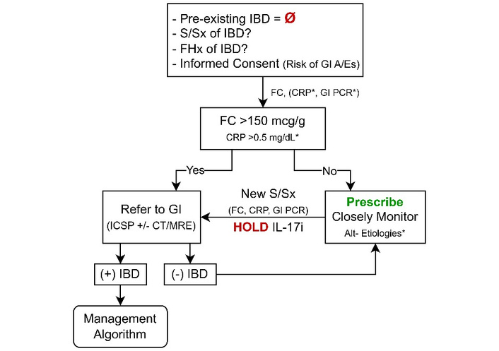 Recommendations for pre-treatment screening and monitoring of IL-17i therapies. A/Es: adverse events; Alt: alternative; CRP: C-reactive protein; CT: computed tomography; FC: fecal calprotectin; FHx: family history; GI: gastrointestinal; IBD: inflammatory bowel disease; ICSP: ileocolonoscopy; IL-17i: interleukin-17 inhibitor; MRI: magnetic resonance imaging; S/Sx: signs and symptoms. *: Items marked with an asterisk are discussed in detail in the main text, which outlines specific caveats and clinical contexts in which they should or should not be considered.